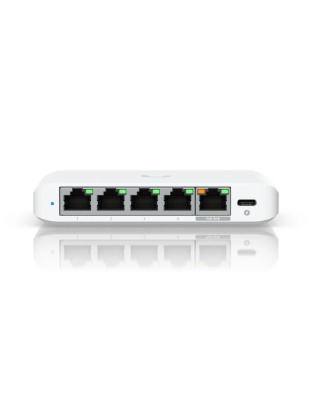 El Ubiquiti UniFi USW-Flex-2.5G-5 es un switch compacto de Capa 2 diseñado para brindar conectividad de red de alta velocidad en cualquier entorno. Es ideal para expandir redes, conectar dispositivos con alto ancho de banda como PCs de escritorio, servidores o puntos de acceso Wi-Fi 7, y puede ser alimentado por PoE o un adaptador USB-C. Su carcasa de policarbonato lo hace adecuado para su uso en interiores. Se gestiona a través de la aplicación UniFi Network, que permite una configuración y monitoreo centralizado.